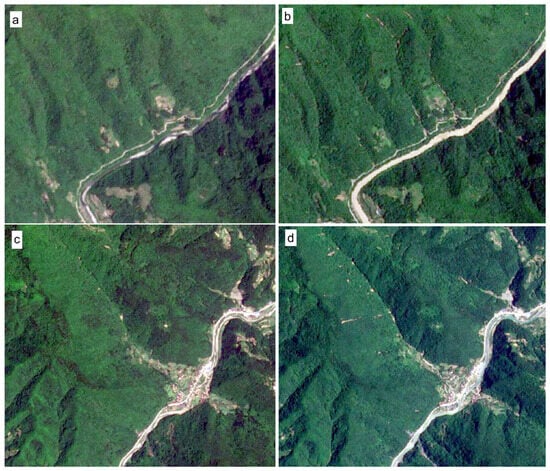 (a,c) Pre-rainfall remote sensing images. (b,d) Post-rainfall remote sensing images.
