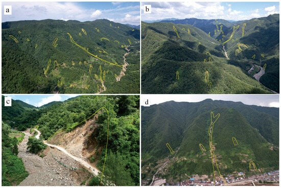 (a,b) Multiple landslides induced by extreme rainfall. (c) Rock landslide triggered by extreme rainfall. (d) Debris flow induced by extreme rainfall. The yellow line denotes the landslide boundary.
