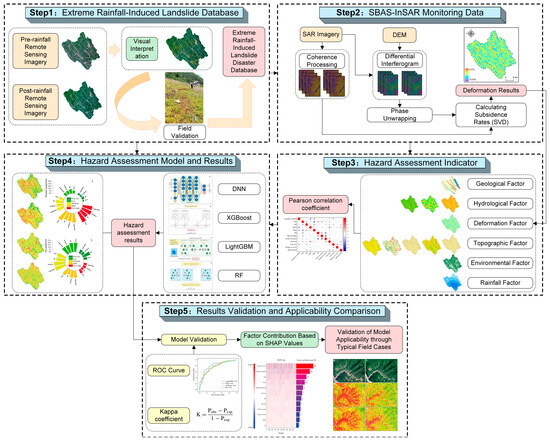 To systematically develop a landslide susceptibility assessment framework under extreme rainfall conditions, this study designed a comprehensive technical approach based on multi-source data fusion, which integrates key methodological components including high-resolution remote sensing image interpretation, SBAS-InSAR surface deformation monitoring, field investigation and validation, and machine learning modeling. The overall methodological workflow is illustrated in Figure 6.