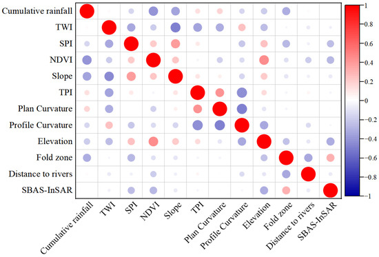 The occurrence of geohazards is controlled by the complex interplay of multiple contributing factors. Given the spatial extent of the study area (512.17 km2), variable selection was used to address spatial heterogeneity and ensure predictive accuracy. Based on field investigations, spatial distribution, and the environmental characteristics of landslides, 12 factors were selected for comprehensive analysis. The selected factors included topographic factors (plan curvature, slope, Topographic Position Index, profile curvature) (Figure 8e,f,i,j); geological structural factors (folding zones) (Figure 8d); hydrological factors (Stream Power Index, Topographic Wetness Index, distance to rivers) (Figure 8b,h,k); vegetation factors (NDVI) (Figure 8c); deformation rate (SBAS-InSAR) (Figure 8a); and precipitation factors (total cumulative rainfall from extreme rainfall events) (Figure 8l). These factors were derived from 12.5 m resolution DEM data, 1:50,000 geological maps, and Sentinel-1 satellite imagery. The selection of these factors was primarily guided by their explicit physical relevance to the mechanisms governing geohazard formation. The velocity map was selected over cumulative deformation as it provides normalized annual rates that facilitate consistent multifactor analysis and long-term trend assessment. Slope directly regulates the gravitational driving forces that control mass movements along hillslopes. Plan curvature and profile curvature affect surface water accumulation and redistribution processes. Lower plan curvature values indicate concave convergent surface morphology that enhances runoff concentration capacity, while lower profile curvature values represent concave slope profiles that decelerate flow and increase the potential for water accumulation. The Topographic Position Index (TPI) characterizes local terrain variations. The Topographic Wetness Index (TWI), integrating slope and upslope contributing area, effectively represents the potential surface water storage capacity per unit area. This metric closely aligns with the pore water pressure response mechanism triggered by extreme rainfall events and has demonstrated superior explanatory power relative to other hydrological factors in numerous landslide susceptibility studies [47,48]. The Stream Power Index (SPI) quantifies the erosive capacity of slope runoff; elevated SPI values signify intensified fluvial erosion, which may compromise slope stability and increase landslide susceptibility. Distance to rivers captures the scouring and toe-erosion effects of surface water on slope bases during extreme rainfall events. The fold zone variable reflects the influence of pre-existing tectonic deformation on the orientation and structural configuration of strata, directly influencing slope failure mechanisms. The normalized difference vegetation index (NDVI) quantifies vegetation cover, which stabilizes slopes through root reinforcement and hydrological interception processes. Additionally, variable selection considered data availability and reliability constraints. Soil type and land use were intentionally excluded from the evaluation framework. For soil type, the study area is uniformly dominated by silty clay, exhibiting minimal spatial heterogeneity in geotechnical properties, thereby limiting its discriminatory capacity for hazard prediction. For land use, the region is predominantly covered by continuous forest, with forest coverage exceeding 85% and minimal anthropogenic disturbance. Moreover, land-use type is highly redundant with the NDVI, which already serves as an effective proxy for vegetation coverage and land-use characteristics. Consequently, these two candidate factors were excluded from the final predictor set. The remaining twelve factors were subjected to Pearson correlation analysis, with the highest absolute correlation coefficient observed at 0.48894 (Figure 9). According to multivariate statistical theory, absolute Pearson correlation coefficients below 0.5 generally suggest the absence of significant multicollinearity [49,50]. Therefore, the selected evaluation factor set exhibits strong independence, with each factor capturing distinct dimensions of geohazard susceptibility, thereby minimizing prediction bias arising from variable redundancy.