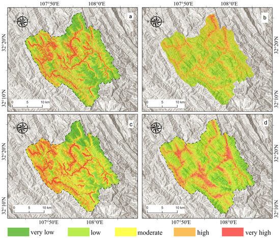 The hazard maps from this study reveal a clear spatial concentration of high-risk zones, with extremely high-risk areas clustered along steep ravines and valley walls, while flat lowlands are classified as low-risk. This pattern reflects the hydrological effects of heavy rainfall. Intense rainfall causes rapid runoff accumulation on steep slopes, leading to the saturation of rock and soil masses. Groundwater flow and river erosion connect adjacent slopes, triggering chain failures [70,71]. This finding is consistent with the studies of Bordoni et al. [72] and Mondini et al. [73], who noted that under extreme rainfall conditions, moisture exchange between slope units increases significantly, promoting the synchronous instability of multiple slopes. Furthermore, disaster patterns resulting from extreme rainfall events differ fundamentally from those under regular conditions, as large-scale rainfall events activate regions that remain stable under normal rainfall, reflecting highly nonlinear interactions among various factors. This is consistent with the work of Mtibaa and Tsunetaka [74], who pointed out that landslide density sharply increases only when multi-period precipitation reaches extreme recurrence levels (such as a centennial threshold), whereas isolated short-duration heavy rainfall events trigger fewer landslides. This explains why record-breaking large-scale rainfall triggers more and larger landslides compared to typical heavy rainfall events, which is consistent with the multifactorial nature of slope instability: intense rainfall saturates rock and soil masses under critical conditions, weakening their strength. Traditional hazard methods, which often assume slope units are independent or use fixed rainfall thresholds, fail to capture these nonlinear cascading effects [75]. As rainfall intensity and temporal distribution change, the spatial patterns of disasters can shift significantly, and extreme rainfall events may trigger slope instability in areas predicted to be low-risk by standard hazard maps. This highlights the urgency and necessity of comprehensive disaster assessments in the context of increasingly frequent extreme climate events.