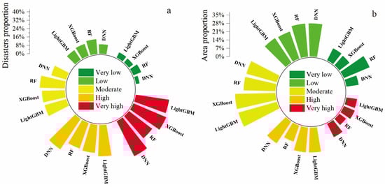 The results of the geological hazard risk assessment under extreme rainfall conditions are presented in Figure 9. The study area is divided into five hazard risk levels based on the established classification framework [23,39]: very low, low, medium, high, and very high. All four hazard maps exhibit a consistent pattern: very high-risk areas are concentrated in steep mountainous regions, particularly along both sides of rivers, while low-lying plains and gentle slopes are primarily classified as low-risk areas. This suggests that under heavy rainfall conditions, areas with steep terrain and water flow convergence are consistently identified as potential landslide hotspots across all models. The consistency among the models improves the overall reliability of the extreme rainfall hazard prediction approach. Although there is general agreement in identifying the key high-risk areas, notable differences exist in the hazard range and intensity predicted by each model. The DNN model identifies the most pronounced and widespread high-risk areas, not only marking known landslide-prone slopes but also identifying newly emerging local hotspots that could be at risk during heavy rainfall events. Due to its neural network architecture, the DNN model captures the complex nonlinear relationships among multiple conditional factors, producing highly detailed hazard maps (Figure 12a). In contrast, the maps produced by LightGBM and XGBoost, while highly consistent with the DNN model in identifying major high-risk areas, show slightly lower continuity in high-risk coverage at the boundary areas (Figure 12c,d). These gradient boosting models tend to concentrate high-risk areas around historically unstable slopes, with fewer discrete high-risk pixels in between. The similarity in the results of LightGBM and XGBoost is noteworthy, as the underlying algorithmic principles of both models are similar, which explains this consistency. Meanwhile, the RF model provides a more conservative hazard estimate: it clearly marks the major landslide-prone areas as high-risk but, compared to other models, classifies a larger proportion of terrain as medium-risk (Figure 12b). Many areas identified as high-risk by the DNN model or the boosting models under extreme rainfall are categorized as medium-risk in the RF map, suggesting that the RF model may underestimate some hazard areas. This conservative prediction by the RF model may result from its ensemble averaging feature, which smooths extreme responses and could potentially overlook fine-scale hazard variations. In terms of disaster proportion (Figure 13a), the DNN model shows a significantly higher proportion of disasters in high-risk areas compared to the other models, indicating that the DNN model performs well in identifying and predicting regions more susceptible to disasters. Additionally, in the high-risk area proportion (Figure 13b), the DNN model shows a larger area proportion, with the area in high-risk zones being much higher than that in the RF model. This suggests that the DNN model provides a more precise prediction of disaster distribution in high-susceptibility regions, effectively capturing disaster occurrence and distribution characteristics.