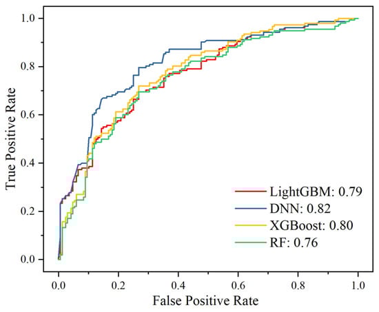 The performance metrics of the four models correspond with the qualitative observations from the maps. Using the ROC curve and the corresponding AUC as evaluation metrics, the DNN model achieved the highest prediction accuracy, with an AUC of 0.82, indicating an excellent ability to distinguish between landslide and non-landslide locations under extreme rainfall conditions. The XGBoost and LightGBM models followed closely, with AUCs of 0.80 and 0.79, respectively. These high AUC scores demonstrate that both boosting models have nearly equivalent and strong predictive abilities, slightly trailing the DNN model. In practical applications, the differences between 0.82 and 0.80 or 0.79 are relatively small, suggesting that XGBoost and LightGBM perform similarly to the DNN model in ranking hazard zones. In contrast, the RF model had the lowest AUC of 0.76 among the four models. Although an AUC of 0.76 still indicates good predictive capability, it is notably lower than the those of other models (Figure 14). Further evaluation using the Kappa coefficient confirmed the model performance ranking (Table 1). The DNN model had a Kappa value of 0.833 during the training phase and 0.812 during the prediction phase, indicating a very high degree of consistency. Similarly, XGBoost had a Kappa value of 0.815 (training) and 0.801 (prediction), and LightGBM had a Kappa value of 0.807 (training) and 0.791 (prediction). The Kappa values around 0.8 during the prediction phase confirm that both the XGBoost and LightGBM models exhibit extremely high accuracy, consistent with their AUC scores. The minimal differences between training and prediction Kappa values suggest that these models have strong generalization abilities and do not show signs of overfitting. In contrast, the RF model had a lower Kappa value, with 0.763 during training and 0.741 during prediction. While still in the “substantial” agreement range, the RF model’s performance lagged behind that of the other models. The lower Kappa value of the RF model (consistent with the AUC result) suggests slightly weaker consistency between the model’s predictions and actual landslide occurrences.
