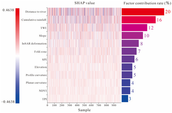 SHapley Additive exPlanations (SHAP) values were calculated for the four trained models (DNN, XGBoost, LightGBM, and RF) to quantify the contribution of each factor to landslide occurrence under extreme rainfall conditions (Figure 15). For each model, SHAP values for all features were computed across 1012 landslides, and the average absolute SHAP value for each feature was calculated as a global importance indicator. The average absolute values for the four models were then averaged and normalized (with the total sum equal to 100%) to obtain the contribution percentage of each factor. A larger average absolute SHAP value indicates a greater influence of that factor [60]. In the SHAP summary plot, the SHAP values for each sample are color-coded, with red indicating a positive contribution to landslide prediction and blue representing a negative contribution. The combined results show that distance to rivers has the highest average contribution (20% of total importance), followed by cumulative extreme rainfall (16%), Topographic Wetness Index (TWI, 12%), slope (10%), InSAR-derived deformation rate (8%), fold zones (7%), and Topographic Position Index (TPI, 3%). The high contribution of distance to rivers reflects its multifaceted hazard-inducing mechanisms under extreme rainfall conditions. Under normal conditions, lateral river erosion continuously undermines riverbank slope stability; however, this process becomes significantly intensified during extreme rainfall events. Flash floods triggered by extreme precipitation rapidly increase river discharge, dramatically altering the stress state of riverbank slopes within a short timespan. Simultaneously, river-adjacent slopes experience pronounced increases in groundwater levels during intense rainfall, substantially elevating failure risk. The TWI, representing potential water accumulation capacity, also plays a significant role, indicating that areas prone to water accumulation exhibit heightened landslide susceptibility under extreme rainfall. The interaction among distance to rivers, slope, and TWI constitutes a hazardous tripartite coupling mechanism under extreme rainfall scenarios. Specifically, elevated TWI values reflect convergent topographic features that promote surface runoff and subsurface flow accumulation along riverbanks, rapidly increasing soil saturation and pore water pressure under intense rainfall. Concurrently, high-magnitude river flows intensify slope toe erosion, further exacerbating slope instability. This synergistic interaction explains the highest SHAP contribution of 20% attributed to distance to rivers. This importance weight reflects not only the direct erosional effects of rivers but also the systemic role of river systems as convergence zones for geomorphological, hydrological, and geological processes. Additionally, SBAS-InSAR deformation rates identify pre-existing ground movements, indicating that zones undergoing creep or deformation are more prone to reaching failure thresholds under rainfall triggers. Overall, the analysis demonstrates that hydrological factors dominate landslide initiation under extreme rainfall conditions, while topographic and geological factors serve as secondary but essential contributors.