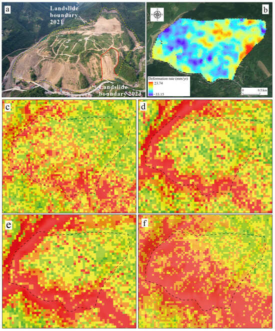 Field validation of landslide, with the black dashed line denoting the landslide extent. (a) Landslide extent comparison. (b) SBAS-InSAR deformation rate map (6 January 2021−1 August 2023). (c) DNN. (d) RF. (e) XGBoost. (f) LightGBM.