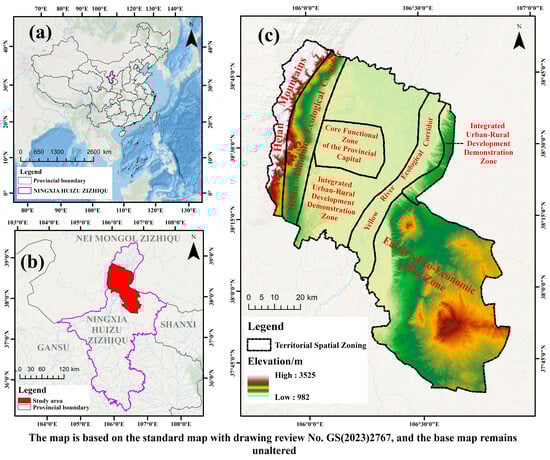 Location of Yinchuan City. (a) Location of NINGXIA HUIZU ZIZHIQU in China. (b) Location of Yinchuan City in NINGXIA HUIZU ZIZHIQU. (c) Yinchuan City territorial spatial zoning and topographic map.