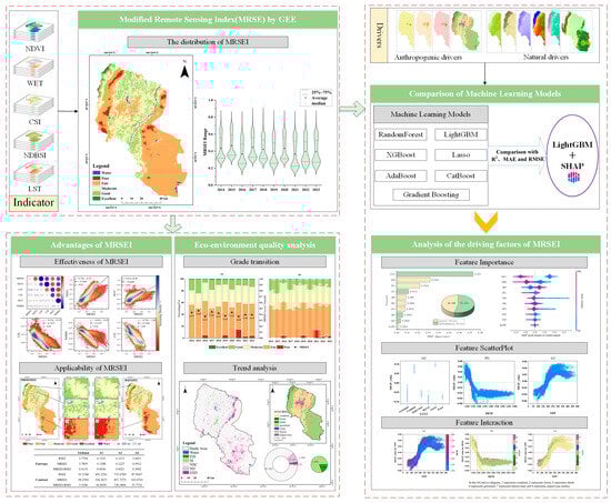 With global climate change and intensified human activities, the ecological environment in arid and semi-arid areas is facing increasingly serious challenges, such as the food crisis [1], land desertification [2], the decline in biodiversity [3], and other prominent problems. China places ecological conservation at the core of its green development strategy, following the sustainable development principle that “lucid waters and lush mountains are invaluable assets”. As a critical ecological barrier in China, the arid northwest region plays a key role in implementing major national ecological projects, including the “Two Barriers and Three Belts” ecological security pattern and the “Northern Sand Control Belt” initiative. Accurate assessment of ecological quality status and its temporal dynamics in China’s arid and semi-arid regions is crucial for enhancing ecological governance and regional planning [4]. However, existing studies overlook critical environmental stressors like soil salinization. This limitation reduces the accuracy of ecological quality quantification and driver analysis in these regions. To address this gap, we innovatively developed the Modified Remote Sensing Ecological Index (MRSEI), which enables a comprehensive dynamic assessment of ecological quality in fragile ecosystems. By incorporating explainable machine learning techniques, our approach enhances understanding of the underlying driving mechanisms. This study establishes a novel methodological framework for regional ecological quality assessment. It also offers new perspectives for tackling global environmental challenges and advancing ecological sustainability.