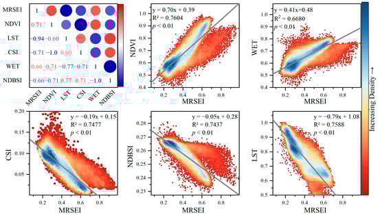 To examine the correlations between individual indicators and the MRSEI, we conducted Spearman’s rank correlation analysis for the year 2022. The results demonstrated significant correlations between all evaluated indicators and the MRSEI (Figure 3). Specifically, the absolute values of correlation coefficients among the indicators ranged from 0.66 to 0.94, indicating strong correlations, and all indicators passed the significance test at p < 0.01. Notably, the newly introduced CSI exhibited a significant negative correlation with the MRSEI, further enriching the explanatory power of the indicator system for the EEQ. In terms of directional relationships, the NDVI and WET showed significant positive correlations with the MRSEI, and the high MRSEI values were primarily concentrated in the high-value zones of these two indicators. This result confirms that vegetation coverage and surface moisture positively contribute to regional EEQ. Conversely, the CSI, NDBSI, and LST exhibited significant negative correlations with the MRSEI, indicating that soil salinization, surface bareness, and land surface temperature exert clear negative impacts on the EEQ. These findings provide important quantitative evidence for regional EEQ and identify key regulatory factors for guiding ecological restoration strategies.