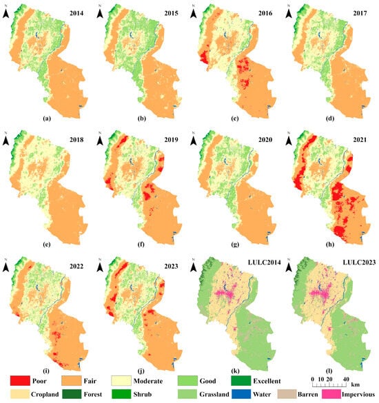 (a–j) MRSEI distribution maps of Yinchuan City from 2014 to 2023, respectively. (k,l) LULC maps for the years 2014 and 2023, respectively.