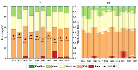 MRSEI grade distribution statistics and grade transition Sankey diagrams. (a) Bar plots of MRSEI grade percentages and line plots of MRSEI mean values. (b) MRSEI grade transitions during the study period.