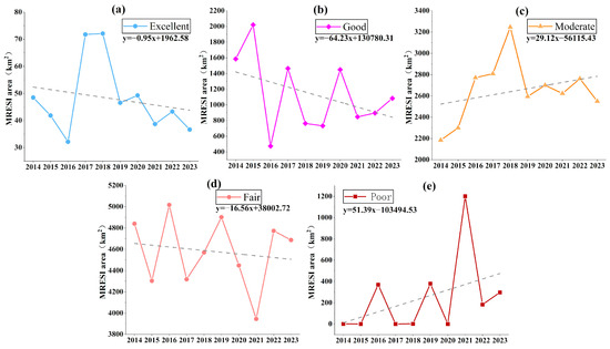 Annual MRSEI grade variation trends. (a–e) indicate the yearly trends of MRSEI grades, namely Excellent, Good, Moderate, Fair, and Poor, respectively. The gray dashed lines represent linear fitting lines, illustrating the trend over time for each MRSEI grade.