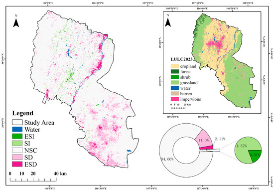 Based on the T-S estimator and M-K test, this study quantified and visualized the spatial/temporal trends of MRSEI changes in Yinchuan City from 2014 to 2023. The spatial distribution of MRSEI trends (Figure 10) reveals that ecological improvement areas were predominantly concentrated in the integrated urban/rural development demonstration zone. This positive trend showed a significant correlation with local government-led ecological restoration projects, including water-saving irrigation promotion, farmland ecological transformation, and wetland conservation initiatives [56]. In contrast, the ecological environment quality of the Helan Mountain ecological corridor, characterized by dense vegetation and minimal anthropogenic disturbance, remained largely stable throughout the study period. Notably, degraded areas exhibited a distinct “severe in southeast, mild in northwest” spatial pattern, with the most pronounced degradation occurring in the Yellow River ecological corridor and eastern eco-economic pilot zone. As illustrated by the land use distribution map of Yinchuan City (Figure 7), extensive expansion of impervious and cropland in the Yellow River corridor has been a major driver of ecological degradation. Human activity disturbances and intensified land development during rapid urbanization, particularly urban expansion along the Yellow River, have reduced the area of natural grasslands, leading to the destruction of the natural ecological environment and degradation of ecological functions on both banks of the Yellow River. Relevant departments should continue to strengthen ecological protection measures in the Yellow River basin. This deterioration trend originated from intensified anthropogenic disturbances during rapid urbanization and increased land development intensity, particularly the urban expansion along the Yellow River that caused natural ecosystem fragmentation and ecological function degradation [58]. MRSEI trend classification statistics (Table 7) revealed that from 2014 to 2023, the ecological quality in Yinchuan City was predominantly characterized by “NSC”, covering 7609.23 km2 (87.92% of the study area). The total improved areas accounted for 1.28%, comprising “ESI” (21.1959 km2, 0.24%) and “SI” (89.8398 km2, 1.04%). Degraded areas represented 10.80%, including “ESD” (143.8580 km2, 1.66%) and “SD” (790.6590 km2, 9.14%). Overall, the degraded areas substantially exceeded the improved areas, indicating a general ecological deterioration trend in Yinchuan City during 2014–2023. Relevant departments should adopt locally specific measures, continue to protect the Helan Mountain ecological corridor, strengthen the governance and restoration of the Yellow River basin, rationally plan the utilization of land resources, and safeguard the ecological environment.
