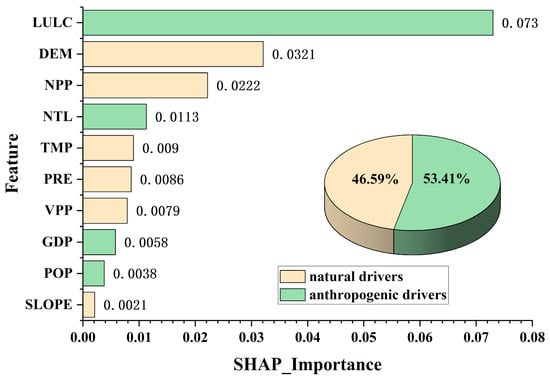 In arid and semi-arid regions, the EEQ is affected by a combination of climate, elevation, socio-economic factors, and other factors. Common approaches used in the study of driving mechanisms include grey prediction models (GM) [20,21], geographically weighted regression (GWR) [22,23], and geographical detectors (GD) [24,25]. However, GM relies on small sample data sizes and does not account for spatial heterogeneity, making it unsuitable for modeling high-dimensional nonlinear relationships or capturing localized differences in driver effects [26]. GWR, while capable of handling spatial variation, is limited to fitting linear or partially linear relationships and assumes independence between natural and anthropogenic factors. This assumption fails to capture the complex nonlinear interactions among variables and their influence on EEQ [27,28]. While GD can detect interactions between factors, it cannot distinguish between the positive and negative effects of drivers [29,30,31]. In recent years, machine learning has played a crucial role in data mining, image recognition, and natural language processing due to its powerful computational capacity. It is widely applied to mine complex non-linear relationships between independent and dependent variables [32]. To enhance the interpretability and reliability of our model predictions, we incorporated SHAP (Shapley Additive Explanations), an interpretable machine learning method based on game theory’s Shapley values. SHAP quantifies the contribution of each feature to model predictions and provides both global and local model interpretations, facilitating a better understanding of model behavior [33,34]. Therefore, this study used machine learning combined with SHAP to comprehensively explore the importance of key driving factors, the intensity of interaction effects, and non-linear functional relationships, offering a novel perspective on the driving mechanisms of EEQ.