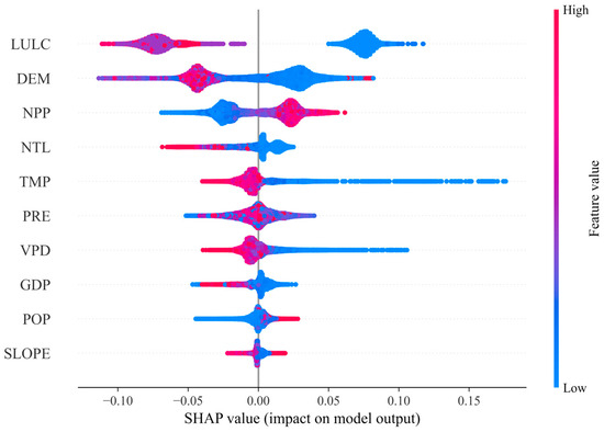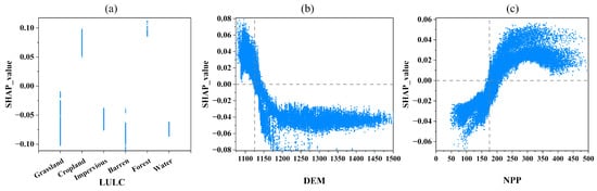 - To explore ecological driving mechanisms, this study applied interpretable machine learning, combining the LightGBM model with SHAP analysis using ten representative natural and anthropogenic factors. LightGBM demonstrated optimal performance (R2 = 0.6918, lowest MAE and RMSE), establishing it as the superior model. SHAP analysis identified LULC, DEM, and NPP as dominant factors: (a) cropland and forest exerted positive effects; (b) DEM (1100–1150 m) significantly enhanced the MRSEI; (c) NPP > 175 g C/m2/yr progressively improved the MRSEI. Interaction effects revealed the highest MRSEI values when NPP > 175 g C/m2/yr and DEM < 1140 m.