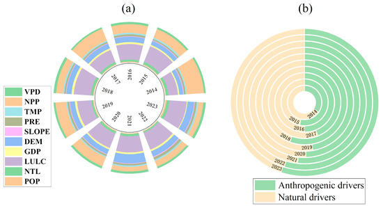 Visualization of MRSEI grade proportions in Yinchuan City (2014–2023) (Figure 8) reveals significant dynamic changes in ecological quality across the study area. Temporally, the MRSEI mean values exhibited a distinct “W”-shaped fluctuation pattern, peaking in 2015 (0.4649), declining to 0.3671 in 2016, recovering to a secondary peak in 2017 (0.4443), then dropping to 0.3764 in 2019, rising again to 0.4343 in 2020, and finally, reaching the study period’s minimum in 2021 (0.3665). A comprehensive analysis of the MRSEI grade composition indicated that Yinchuan City was predominantly characterized by “Fair” and “Moderate” ecological quality levels during this decade. In contrast, the proportions of “Good” and “Excellent” grades remained relatively low, with the “Excellent” grade showing stable proportions year-to-year. The “Poor” grade, however, exhibited notable increases in 2016, 2019, and 2021, corresponding with the lowest points in the MRSEI time series. To clarify transitions between ecological quality grades, we generated Sankey diagrams of the MRSEI grade transfer matrices for Yinchuan City (2014–2023) (Figure 8b). These diagrams reveal that the “Excellent” grade maintained high stability, while frequent transitions occurred among “Fair”, “Moderate”, and “Good” grades. These mutual conversions between adjacent grades likely represented the primary driver of MRSEI fluctuations. Notably, recurrent fluctuations between “Fair” and “Poor” ecological quality grades were observed in 2016, 2019, and 2021, demonstrating a characteristic annual transition pattern, downgrading from “Fair” to “Poor” followed by subsequent upgrading back to “Fair” the following year. This distinct grade alternation showed significant coupling with phased MRSEI declines, suggesting potential threshold responses in ecological quality induced by climatic variability or intensive anthropogenic disturbances.