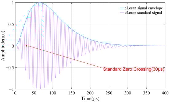 According to the specification developed by the Radio Technical Committee for Marine Services (RTCM), the standard zero crossing of an eLoran signal is defined as the 30 μs after the pulse onset, that is, the forward zero crossing of the third carrier cycle [32]. The phase tracking point is fixed at the standard zero-crossing point, which provides a time reference for the precise measurement of the time of arrival (TOA) and realizes the timing function. Figure 1 illustrates the standard eLoran signal waveform envelope along with its standard zero-crossing.