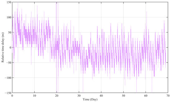 where stands for the primary time-delay factor, stands for the second time-delay factor, and stands for the additional second time-delay factor. In fact, combined with the existing research results, it can be seen that for fixed eLoran signal transmitting station and differential reference station, the value of should maintain a fixed value or show almost no fluctuation after removing the influence of random noise and data jumps. In fact, due to the continuous change in meteorological factors on the propagation path, the propagation medium on the path will also change, and then the value of will fluctuate, causing the time-delay value of eLoran signal to fluctuate in the order of about hundreds of nanoseconds [33,34]. Figure 3 shows the fluctuation curve of the effective data collected by Baoji differential reference station for a long time after removing the coarse value, jump, mean, and other operations.