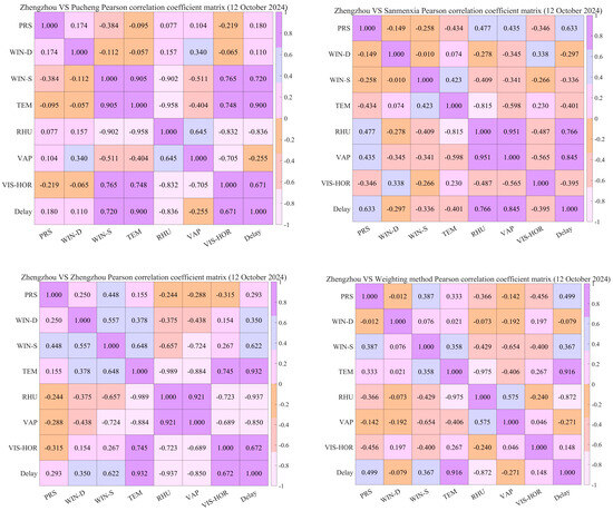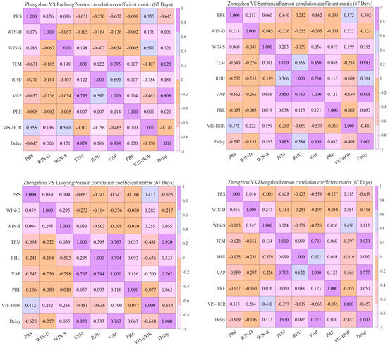 According to the visual display in Figure 4 and Figure 5, it can be observed that there is a strong correlation between temperature, air pressure, vapor pressure, and time-delay variation, and the correlation between the signal propagation delay and temperature data variation is more obvious. To further explore this relationship, taking the Zhengzhou differential reference station as an example, a long-term correlation analysis was conducted on the valid propagation delay data from 12 October 2024 to 1 January 2025 (67 days) with the relevant meteorological element observation data from multiple national-level meteorological stations along the signal propagation path. The results are shown in Figure 6.