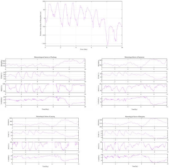 It can be seen from Section 2.2 that the fluctuation of meteorological factors, such as temperature, humidity and atmospheric pressure, will affect the propagation delay, which is finally reflected in the fluctuation of numerical values. Figure 4 shows the schematic diagram of the fluctuation curve of the effective time-delay measurement value received by Sanmenxia and other differential reference stations from 12 October 2024 to 1 January 2025, after removing the coarse value and abnormal value, subtracting the mean value, and then smoothing filtering and down sampling. Figure 5 shows the data change curves for the various meteorological factors collected by multiple weather stations on the same propagation path in the same time period (only parts of the meteorological factors are drawn due to space limitations).