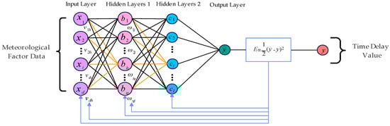 According to the calculation formula of propagation delay, due to the change in meteorological factors, the value of the propagation delay also changes. Propagation delay is affected by the explicit or implicit effects of meteorological factors, and there are complex nonlinear relationships between meteorological factors, so it is difficult to use simple mathematical analytical models to directly model propagation delay. The literature [47,48,49,50] uses neural networks to establish the relationship model between meteorological factors and propagation delay and effectively predicts the signal propagation delay. Based on these, we choose the BP neural network to facilitate the comparison and evaluation of the prediction effect of propagation delay in long-distance scenarios within the existing research context. This study intends to establish the corresponding BP neural network fitting model for a variety of meteorological factors at multiple weather stations on the path in the long-distance transmission scenario. The input of the model is various meteorological factor data, such as temperature, humidity, air pressure, precipitation, etc., at a certain location along the path. The number of nodes in the input layer needs to be determined specifically based on the situation of the prediction task. The output of the model is the propagation delay data of the location to be predicted, with the number of nodes being 1. Experience shows that deep networks do not significantly improve the performance of the prediction model in the current application scenario and are prone to overfitting problems. Therefore, it is better to limit the number of hidden layers to 1 or 2. Then, the number of nodes in the hidden layer is estimated based on the empirical formula , where d is the number of nodes in the input layer, l is the number of nodes in the output layer, and m is an integer within the range of 1 to 10. Different BP neural network models are constructed, and the optimal number of nodes in the hidden layer is determined through the method of experiments and parameter adjustment based on experience. There are three common activation functions, namely sigmoid, tanh, and RELU [51,52,53,54,55,56,57,58,59]. After testing, it was found that the sigmoid activation function performed the best among the three activation functions. Therefore, the activation function of all BP neural network prediction models in this paper is taken as the sigmoid function. A total of 14 different models were established in this chapter, all using the method of experiments and parameter adjustment based on experience. The number of hidden layers and nodes, learning rate, and learning times were set, respectively. Due to space limitations, the models presented in the article are the optimal parameter models selected through the trial-and-error method. In Section 4.4, the settings of the input layer, output layer, hidden layer, and other related parameters of the multi-meteorological factor BP neural network (PSLZM-BPNN) from Pucheng to Sanmenxia, Luoyang, and Zhengzhou are described in detail. The basic principle of BP neural network can be formally represented as the structure in Figure 9.