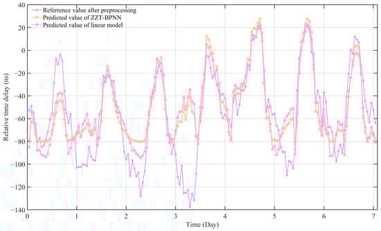In addition, according to the test results, the RMSE of the temperature linear model was 24.4840 ns, and the MAE was 17.4091 ns, which was slightly worse than the ZZT-BPNN model, but better than the BP model of humidity and pressure. At the same time, the performance of the two linear models of humidity and air pressure were not as good as their corresponding BP neural network models, and the performance of the two linear models was not as good as that of the temperature linear model. This is because the linear correlation between temperature and propagation delay was more obvious, so the prediction effect of their corresponding models was also significantly better. This result further indicates the superiority of the BP model in dealing with complex nonlinear relationships.