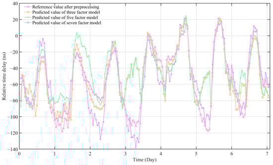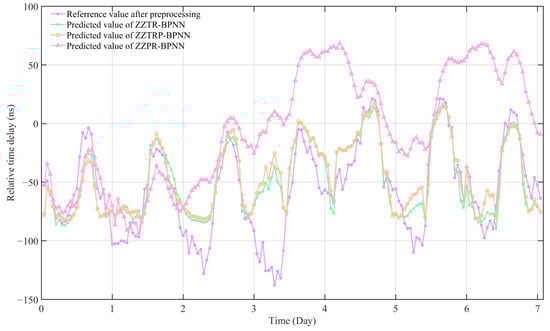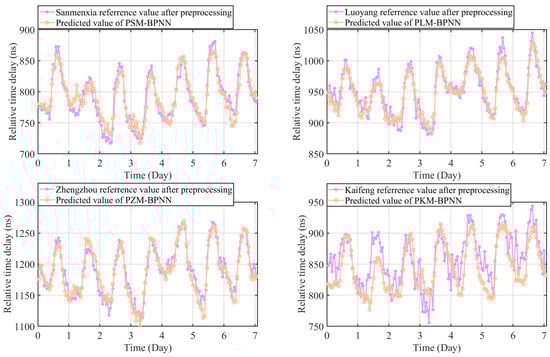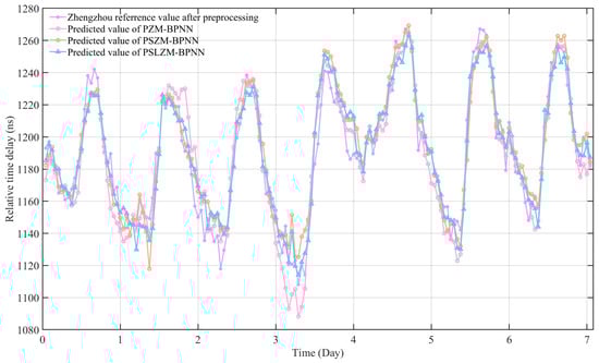 From the observation data of the four observation points, 60 days of meteorological data and propagation delay data (about 90% of the total data) were randomly selected as the training set to construct the BP neural network model, and the remaining 7 days of each data set (about 10% of the total data) were used as the test set of the corresponding data. A variety of BP neural network models were built by using a variety of meteorological factor characteristic matrices of Pucheng–Zhengzhou, Pucheng–Sanmenxia–Zhengzhou, and Pucheng–Sanmenxia–Luoyang–Zhengzhou meteorological stations to predict the signal propagation delay of the Zhengzhou differential reference station; the models were compared and analyzed, and their performance was evaluated. The test results are shown in Figure 16. The relevant parameters of the BP neural network for the multi-weather factor prediction from Pucheng to Sanmenxia, Luoyang, and Zhengzhou are as follows: The input layer of the model has 1 node, and the total number of nodes is 28. The input data consist of seven weather factor data from Pucheng, Sanmenxia, Luoyang, and Zhengzhou. The output layer of the model has one node, and the output data is the propagation delay data of Zhengzhou. The number of hidden layers is set to two. The optimal number of nodes in the hidden layer is determined through experimental and empirical adjustment methods, resulting in values of 12 and 5, respectively. The activation function is the sigmoid function, the learning rate is 0.001, and the number of learning iterations is 10,000. For ease of presentation, the optimal parameter models are named as: follows Pucheng–Zhengzhou multi-meteorological factor BP neural network (PZM-BPNN), Pucheng–Sanmenxia–Zhengzhou multi-meteorological factor BP neural network (PSZM-BPNN), and Pucheng–Sanmenxia–Luoyang–Zhengzhou multi-meteorological factor BP neural network (PSLZM-BPNN).