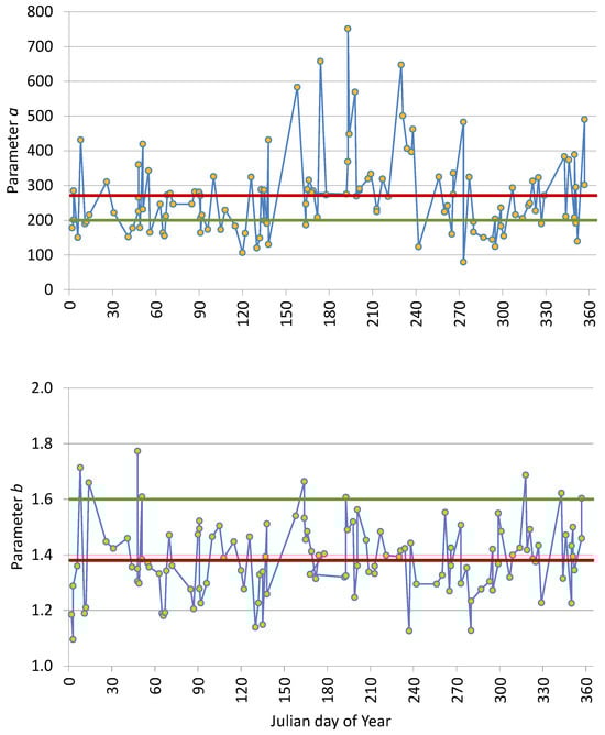 Values of the parameters a and b of the Z–R relationship for individual precipitation events (points). Horizontal red and green lines represent the mean values estimated in this study and the reference values proposed by Marshall and Palmer, respectively.