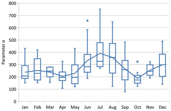- The highest unit values of the parameter a, as well as its highest mean and median values, were recorded in June, July, and August. The occurrence of these maximum statistical values in the summer months is as expected, as this period is particularly associated with convective rainfall. The presented results for the parameter a highlight the need for further research into its temporal variability under different meteorological conditions, such as those associated with the occurrence of stratiform and convective precipitation.
