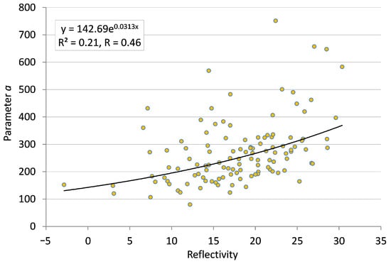 Based on this rationale, the present study sought to correlate the values of the parameter a for individual events (N = 118) with the mean, median, or maximum values of reflectivity Z (in units of dBZ), calculated at a 1 min resolution for relevant events. The highest correlation coefficient was obtained for the relationship between the parameter a and mean reflectivity.