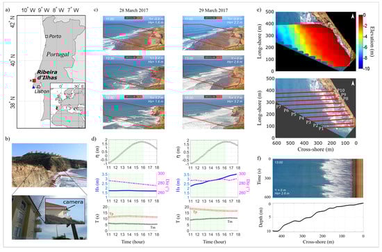 Through collaboration with Surftotal company (https://www.surftotal.com), video data were obtained from an online-streaming RGB webcam (Figure 1b,c), which provided a fixed view of the Riberia d’Ilhas shore and nearshore for two days (28 and 29 March 2017). The camera was mounted on a house roof approximately 80 m above mean sea level (MSL), located 400 m from the shoreline. Image frames (800 × 450 pixels) were extracted from a total of 12 h of video footage, captured at 5 Hz (5 frames per second) during the rising tide phases on both days (Figure 1d).