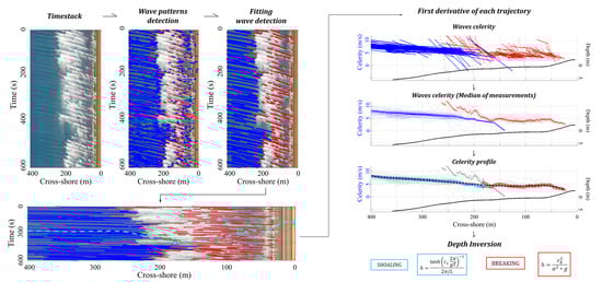 Wave celerity assessment workflow. After wave pattern detection and fitting, wave celerity is computed as the first derivative for shoaling (blue) and breaking (red) waves. Next, the wave celerity at the breaking points (apparent acceleration) is filtered out using the pixel intensity profile (dashed cyan), whose peak (cyan triangle) identifies the boundary between the outer and inner surf zones (see also [] for further details). Finally, the celerity profile is used to infer bathymetry using linear and non-linear formulas for shoaling and breaking waves, respectively.