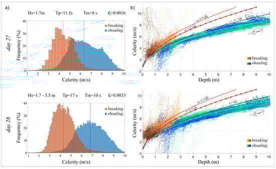 Wave celerity analysis. (a) Histogram of breaking (orange) and shoaling (blue) wave celerity during the first (upper) and second days (lower). Wave characteristics are also reported, namely, offshore wave height (Hs), peak period (Tp), mean period (Tm), and wave steepness (ε); (b) depth-dependent wave celerity during the first (upper) and second days (lower). The color bars represent sea level, ranging from the lowest (lightest colors) to the highest (darkest colors) tidal elevations, for both breaking (orange to black) and shoaling (green to blue) waves. The graphs also show the modeled celerity for breaking (dotted red lines) and shoaling (dotted black and cyan lines) waves.