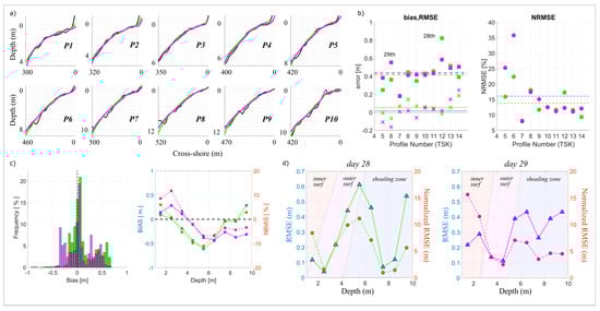 Depth inversion assessments. (a) Bathymetric profiles (P). The black lines represent the profiles measured using the traditional technique, green and magenta lines show the profiles obtained from the depth inversion method during the first day (28) and the second day (29), respectively; (b) bias and Root Mean Square Error (RMSE) for each profile on both days (left), and depth-normalized NRMSE (right). Dashed lines indicate the median error values; (c) total bias for all profiles (left), along with depth-related and depth-normalized bias (right); (d) RMSE (triangles) and depth-normalized NRMSE (circles) for all profiles across both days. Shaded areas indicate depths associated with different wave transformation zones: inner surf, outer surf, and shoaling zones.