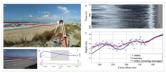 Preliminary test on a double-barred beach. (a) Overview of the site, with the temporary installation of the camera on the dune crest. The red line indicates the profile considered for testing the video-based depth inversion; (b) example of Timex images produced over 10 min time interval. The red line indicates the profile considered for testing the video-based depth inversion; (c) hydrodynamic condition during the experiment, with significant wave height (Hs), sea level (η), peak wave period (Tp), and wave direction (Dir). Grey background indicates the interval of camera recording (6 h); (d) example of Timestack image produced over the considered transect during 10 min time interval; (e) depth inversion results (blue circles and red line) plotted over the profile (black line) surveyed by a jet-sky before the video experiment.
