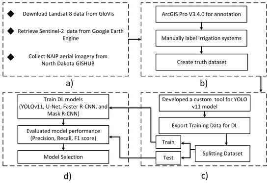 Workflow for detecting irrigation systems using deep learning models: (a) data acquisition, (b) annotation and ground-truth creation, (c) dataset preparation, and (d) model training, testing, and evaluating.