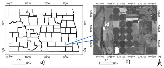 Study area: (a) North Dakota map, and (b) examples of center-pivot irrigation systems.