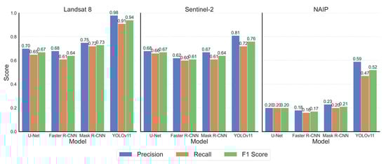 Unlike the strong performance of YOLOv11 on Landsat 8, other combinations of deep learning models and datasets exhibited less satisfactory performance. Sentinel-2 multispectral imagery, although widely used in agricultural remote sensing, showed a decline in detection accuracy compared to Landsat 8. The best performance on Sentinel-2 was observed with YOLOv11 (F1-score: 0.76), which was considerably lower than the corresponding performance on Landsat 8. This result is consistent with findings from [], who demonstrated that the PVANET–Hough model, when applied to Sentinel-2 images, could detect CPISs with high precision but required additional post-processing steps for accurate delineation.