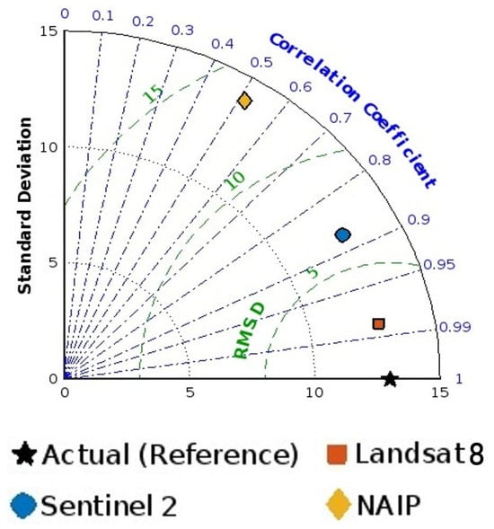 To compare the actual number of irrigation systems with the predicted values generated by the trained YOLOv11 models using different datasets, the trained models were applied to the 30 randomly selected locations across North Dakota as the ground-truth dataset. Figure 6 presents the results of this comparison using a Taylor Plot, which provides a statistical assessment of model accuracy by visualizing key performance metrics such as correlation, standard deviation, and centered RMSE. The results demonstrate that the combination of YOLOv11 and the Landsat 8 panchromatic band achieved the highest accuracy among all datasets. This suggests that, despite its lower spatial resolution, the generalized granularity of the Landsat 8 panchromatic band allows the deep learning model to better distinguish irrigation system patterns, leading to improved detection performance compared to higher-resolution datasets that introduce more complexity and noise.