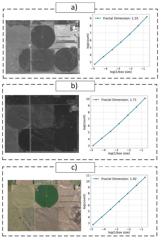 Fractal dimension of clipped images: (a) Landsat 8, (b) Sentinel-2 (NIR band), and (c) NAIP.