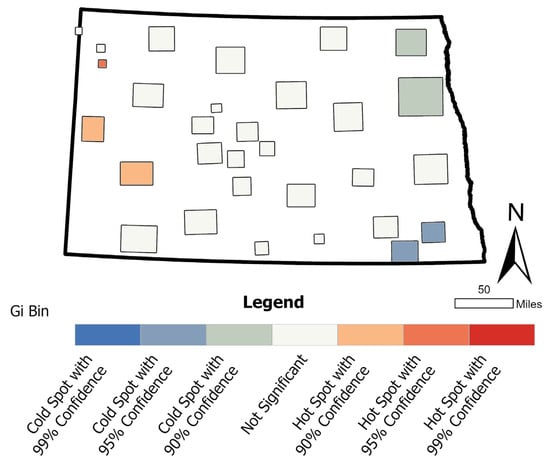 The hotspot analysis (Figure 9), conducted specifically for the YOLOv11 model using Landsat 8 PAN imagery, reveals distinct clusters of prediction errors, with hotspots (over-predictions) concentrated in the western regions and coldspots (under-predictions) predominantly in the eastern regions of North Dakota. This spatial pattern highlights regional variations in model accuracy, likely influenced by differences in landscape characteristics, irrigation density, and dataset suitability. Such findings align with previous studies that emphasize the importance of spatial variability when evaluating deep learning model performance in remote sensing applications []. These results provide actionable insights for refining the model by enabling targeted improvements in training data collection, model parameter adjustments, and adaptive training strategies.