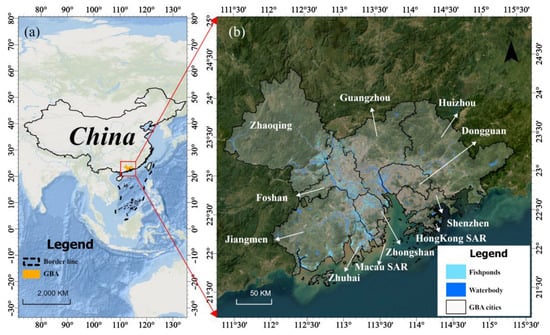 (a) Geographical location of the GBA in China, and (b) distribution of fishponds in the region.