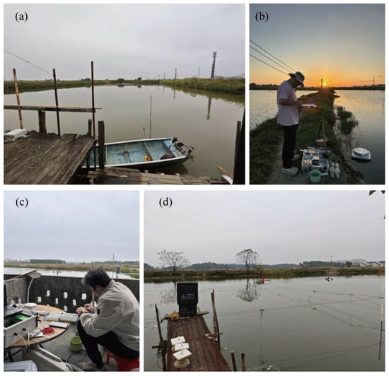 On-site sampling in fishponds; all the photos were taken by the authors. (a) and (d) are photos of fishponds in Zhongshan and Huizhou, respectively, while (b) and (c) are photos of water samples taken by the author.