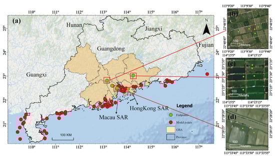 Spatial configuration of sampling sites: (a) The location of sampling sites in Guangdong province, the green points represent field measurements from fishponds by the authors and red points represent water quality monitoring stations from coastal waters. (b–d) Enlargements of field measurements from fishponds in FS, HZ, and ZS, respectively.