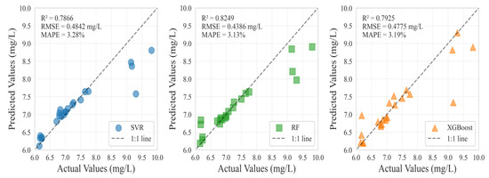 To further assess the performance of the proposed RF model, two alternative machine learning models—SVR and XGBoost—were developed and directly compared. The SVR model utilized kernel functions to project EMD-decomposed features into a high-dimensional space, which allowed it to capture complex, nonlinear relationships within the dataset more effectively [59]. In contrast, the XGBoost model employed a gradient boosting framework that iteratively minimizes prediction errors by combining the outputs of multiple weak learners, which thereby enhances the overall model accuracy and robustness [60]. Both SVR and XGBoost models have been widely adopted in water quality assessment studies, including the estimation of DO concentrations [9,61,62].