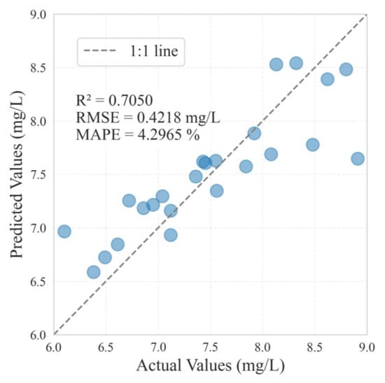As presented in Table 1, the observed DO concentrations in this study range from 5.68 to 9.97 mg/L. This relatively short range introduces a potential risk of extrapolation errors when predicting higher DO concentrations (e.g., DO > 10 mg/L) that are outside the original data distribution. Given the absence of a well-established theoretical framework for the underlying natural processes, such extrapolations can be highly uncertain and prone to significant inaccuracies. To mitigate this issue, we included additional DO data from Lake Huron [22], which exhibits a broader DO range (5.84 to 14.77 mg/L), and thereby extended the model’s predictive capacity to higher DO concentrations.
