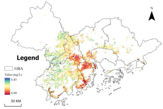 Figure 8 illustrates the spatial distribution of average DO concentrations in the GBA from 2013 to 2023. In this region, the DO levels predominantly range from 6.80 to 8.45 mg/L, with an overall average of 7.44 mg/L (Table 3). Higher DO concentrations are primarily observed in the central regions of the study area, including Zhaoqing, western FS, northern Jiangmen, and HZ, while lower levels are evident in peripheral regions such as southern Jiangmen, southern Guangzhou, ZS, and eastern FS. Overall, there is a clear trend of decreasing DO levels from the periphery toward the center of the region. Moreover, significant human interventions can cause areas with similar natural conditions to exhibit varying DO concentrations.