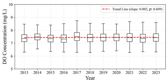 An analysis of the predicted DO concentrations from 2013 to 2023 (Figure 9 and Figure 10) revealed that, although the annual mean DO concentrations exhibited fluctuations, they remained relatively stable overall, with no obvious trend. Specifically, during the 2013–2014 period, the DO concentrations experienced a slight upward trend, increasing by 1.6%. In the subsequent period (2014–2016), the DO levels experienced a continuous decline, with a cumulative decrease of 2.2%. Between 2016 and 2018, the DO concentrations changed more markedly, initially increasing by 2.7%, followed by a 1.3% decline, which indicates a slight oscillatory behavior. From 2019 to 2023, the DO concentrations entered a relatively stable phase, with only minor fluctuations being observed, which suggests a gradual stabilization of water quality dynamics in the study area.