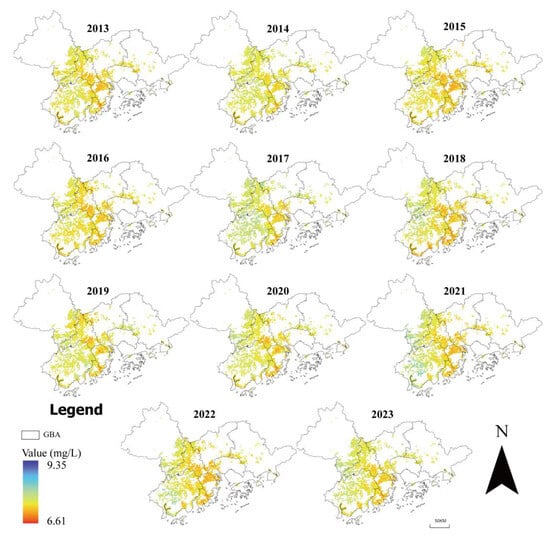 The spatial distribution of annual DO concentrations across the GBA from 2013 to 2023.