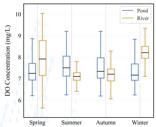 In addition, this study revealed distinct seasonal patterns in the DO concentrations within fishponds. The results (Figure 11) demonstrated that the mean DO levels reached their maximum in summer (7.5 mg/L) and their minimum in winter (7.16 mg/L), exhibiting a pattern that contrasts with the seasonal variations observed in natural water bodies. Spatially, the western GBA region, encompassing Zhaoqing, Jiangmen, and western FS, showed notably higher DO concentrations during spring and autumn compared to the eastern region (Figure 12). Interestingly, the fishponds in Zhuhai and ZS consistently maintained lower DO concentrations throughout all seasons. Natural water bodies, on the other hand, display more pronounced seasonal characteristics. Figure 11 also shows the variation in the DO in rivers, which is distinct from that of the fishponds. Originally, the DO in winter is higher than that in other seasons and reaches the lowest concentration in summer.