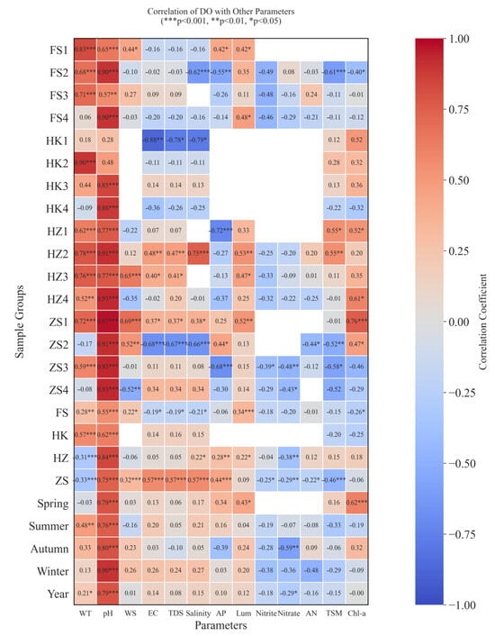 Numerous studies have examined the factors that influence DO concentrations, primarily focusing on natural environments such as oceans, rivers, and lakes [8,22,65]. However, relatively few have examined DO dynamics in fishponds, which are strongly disturbed by human activities. Utilizing measured data from both fishponds and a coastal river in Guangdong [66], this study analyzed and evaluated the key drivers of DO concentration changes in fishponds and compared them with those in natural water bodies. Furthermore, the relationships between the DO levels and explanatory variables were elucidated through correlation analysis, while the LMG model was employed to quantify the relative contributions of these variables, providing critical insights to support the model’s predictions.